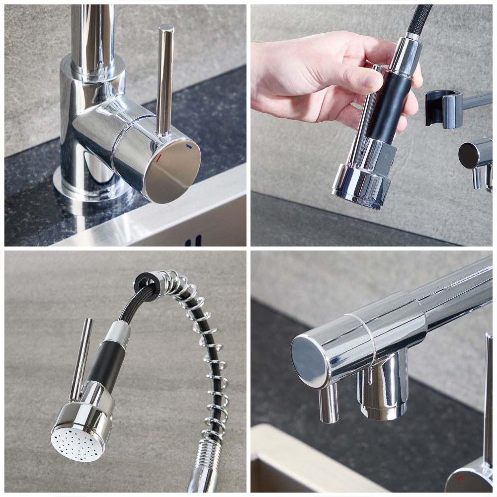 Diese Küchenarmatur besteht aus massivem Messing und verfügt über ein modernes, geschwungenes Design mit einem robusten Finish in Chrom. Sie verfügt zudem über eine herunterziehbaren 360° drehbaren Brause, welche Ihnen zusätzlichen Komfort beim Spülen bietet. Der Einhebelmischer hilft beim mühelosen Einstellen von Durchfluss- und Temperatur.