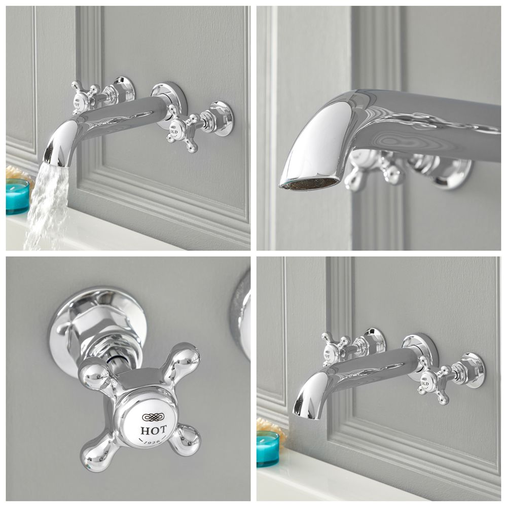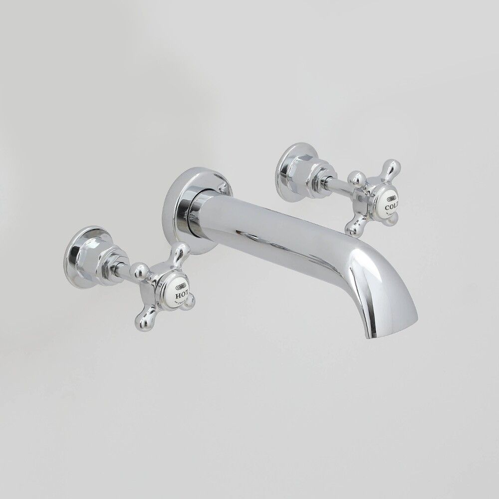 Die Wannenarmatur besteht aus Messing und bietet Ihnen somit jahrelange Haltbarkeit, während das elegante Design durch ein verchromtes Finish sowie den Kreuzgriffen mit weißen Keramikdetails vervollständigt wird. Dank der Wandmontage bleibt Ihnen dabei mehr Platz am Wannenrand und es wird für ein ordentliches Erscheinungsbild gesorgt.