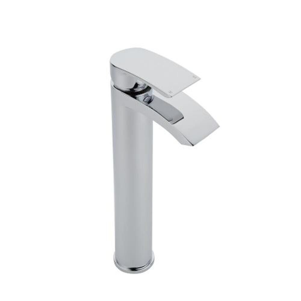 Die hohe Waschtischarmatur mit Wasserfallausguss verleiht dem Ensemble den letzten Schliff. Sie ist aus verchromten Messing gefertigt, während der Einhebelmischer eine mühelose Regulierung garantiert.