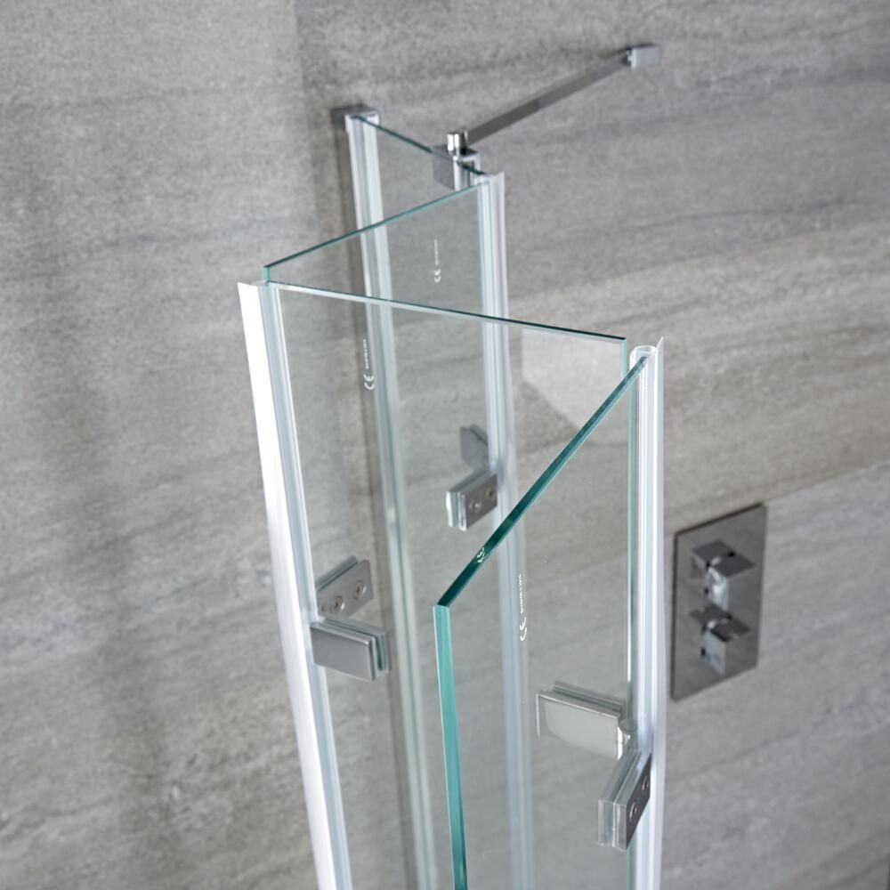 Die Glaswand verfügt über ein praktisches Falt-Design – so gelangen Sie ganz einfach an die Armatur oder Dusche. Außerdem schützt das 5mm verstärkte Glas mit pflegeleichter Beschichtung gegen Flecken und verringert somit den Reinigungsaufwand.