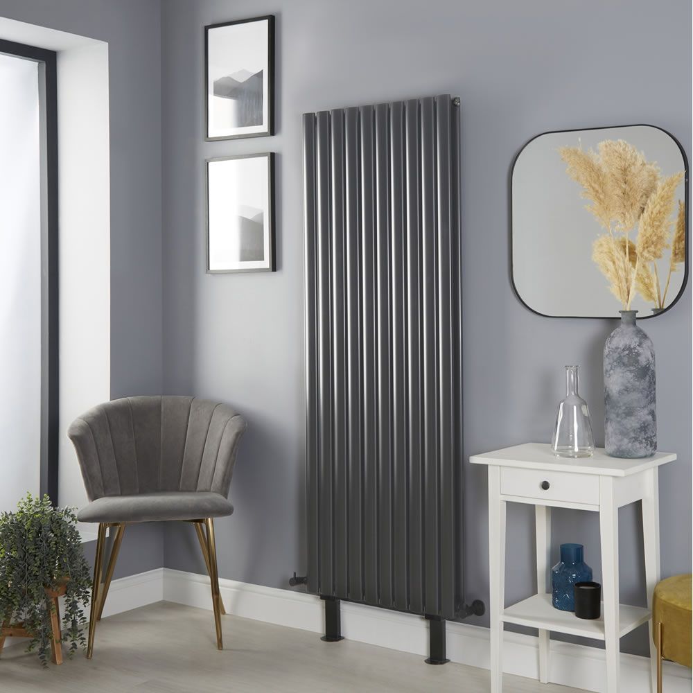 Der vertikale Revive Designer Heizkörper in Anthrazit, inklusive Füße zur Bodenmontage, überzeugt mit Form und Funktion.