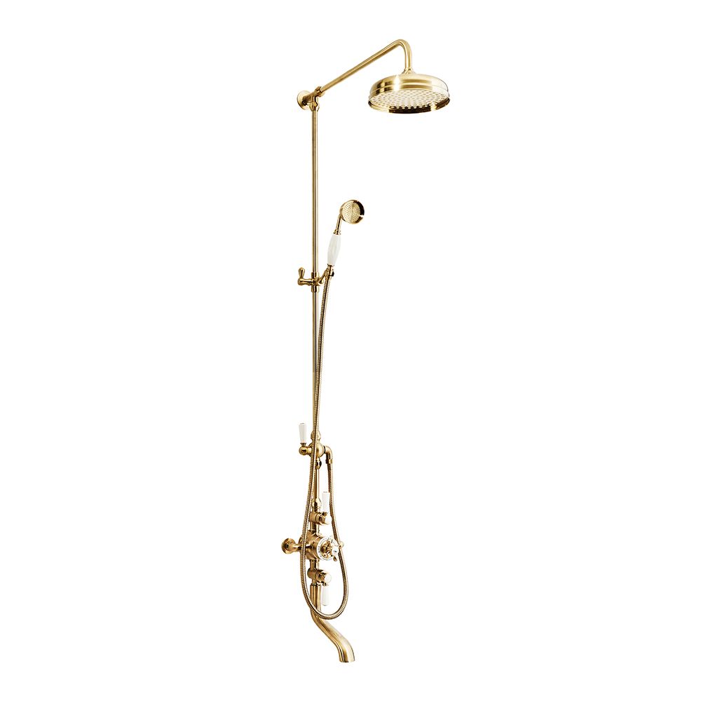 Kreieren Sie einen stilvollen Vintage-Look und genießen Sie ein luxuriöses Duscherlebnis mit der Elizabeth Duschsäule in satiniertem Gold, komplett mit Aufputz-Thermostat, Wanneneinlauf, Duschkopf und Handbrause.