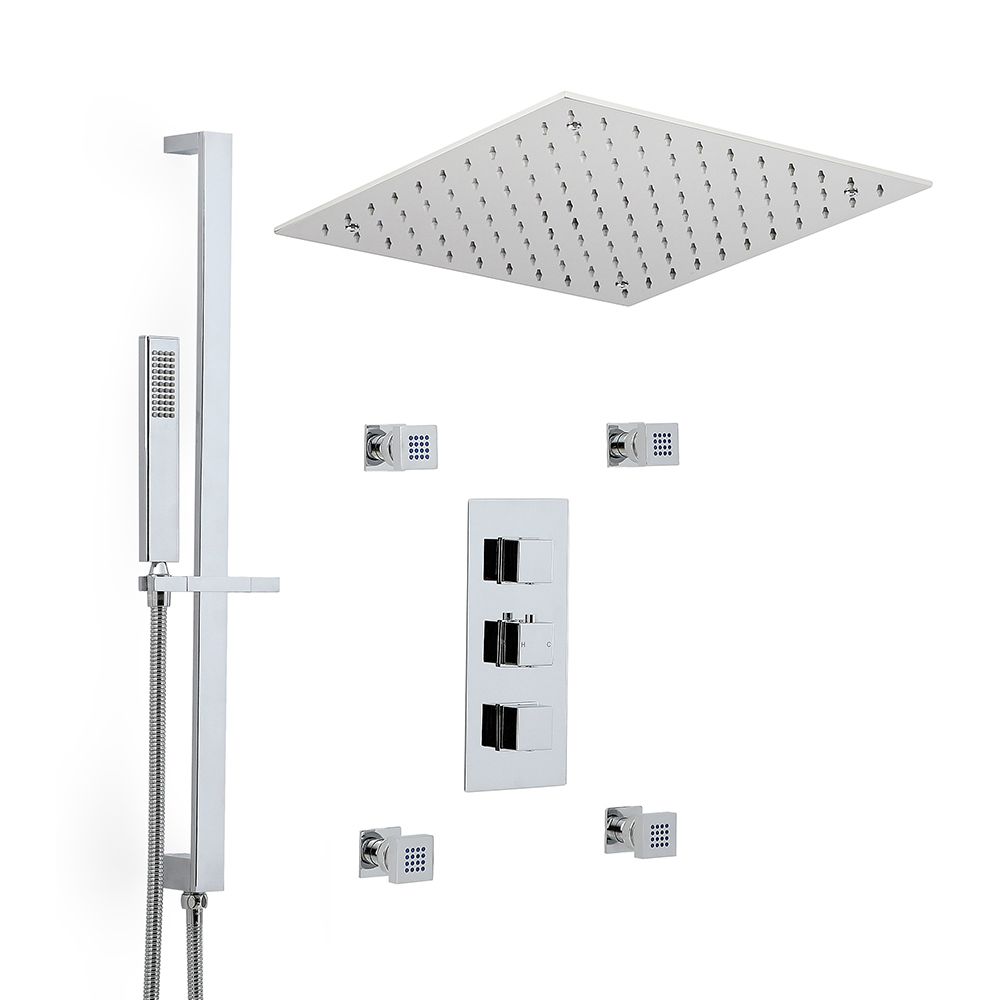 Eckiges Dusch-Thermostat mit Umsteller, 400x400mm Decken-Duschkopf, Brausestangenset und Massagedüsen, Chrom - Kubix
