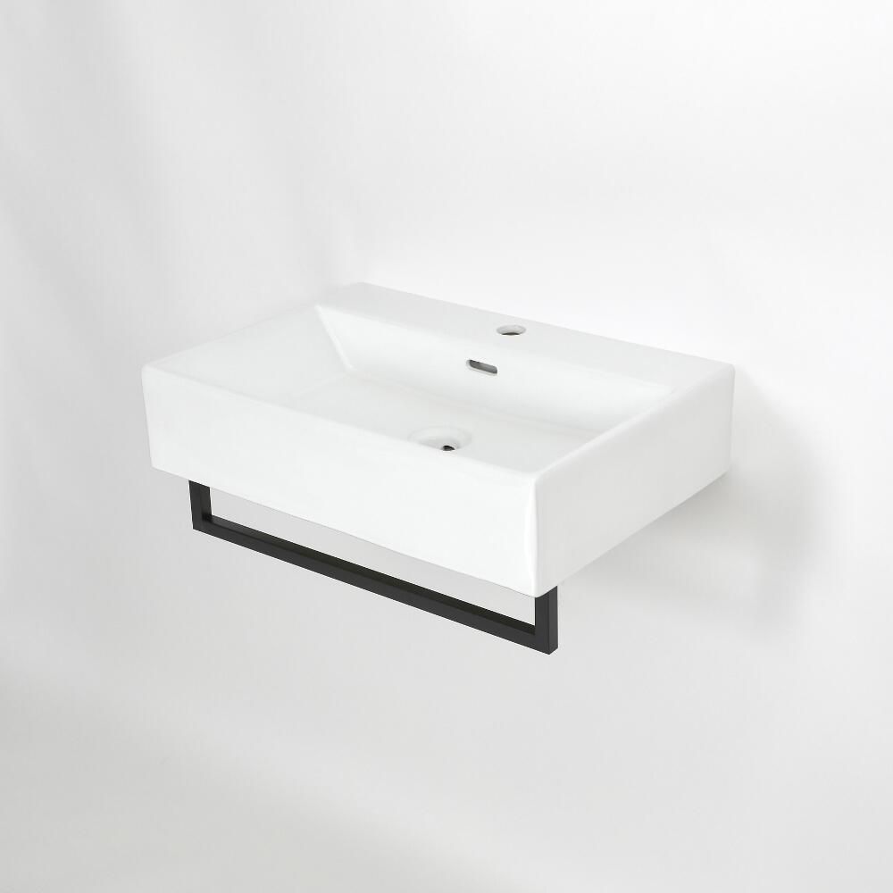Das Sandford Hängewaschbecken in Weiß mit integriertem Handtuchhalter in Schwarz verleiht Ihrem Bad eine moderne minimalistische Optik.