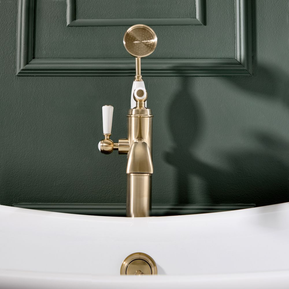 Diese freistehende Badewannenarmatur wurde aus Messing gefertigt und verzaubert mit einem Finish in satiniertem Gold. Sie eignet sich perfekt zur Nutzung mit unseren freistehenden Wannen. Das elegante Design wird durch eine Handbrause und einen 1,5m langen Schlauch ergänzt, während der Keramikhebel eine mühelose Regulierung des Wassers und der Temperatur gewährleistet.