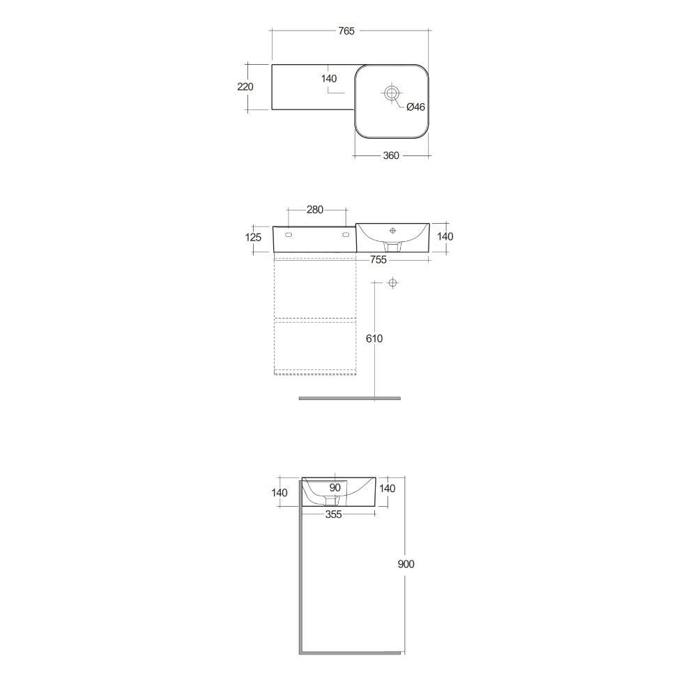 - Dimensionen: B 765mm x T 360mm x H 140mm