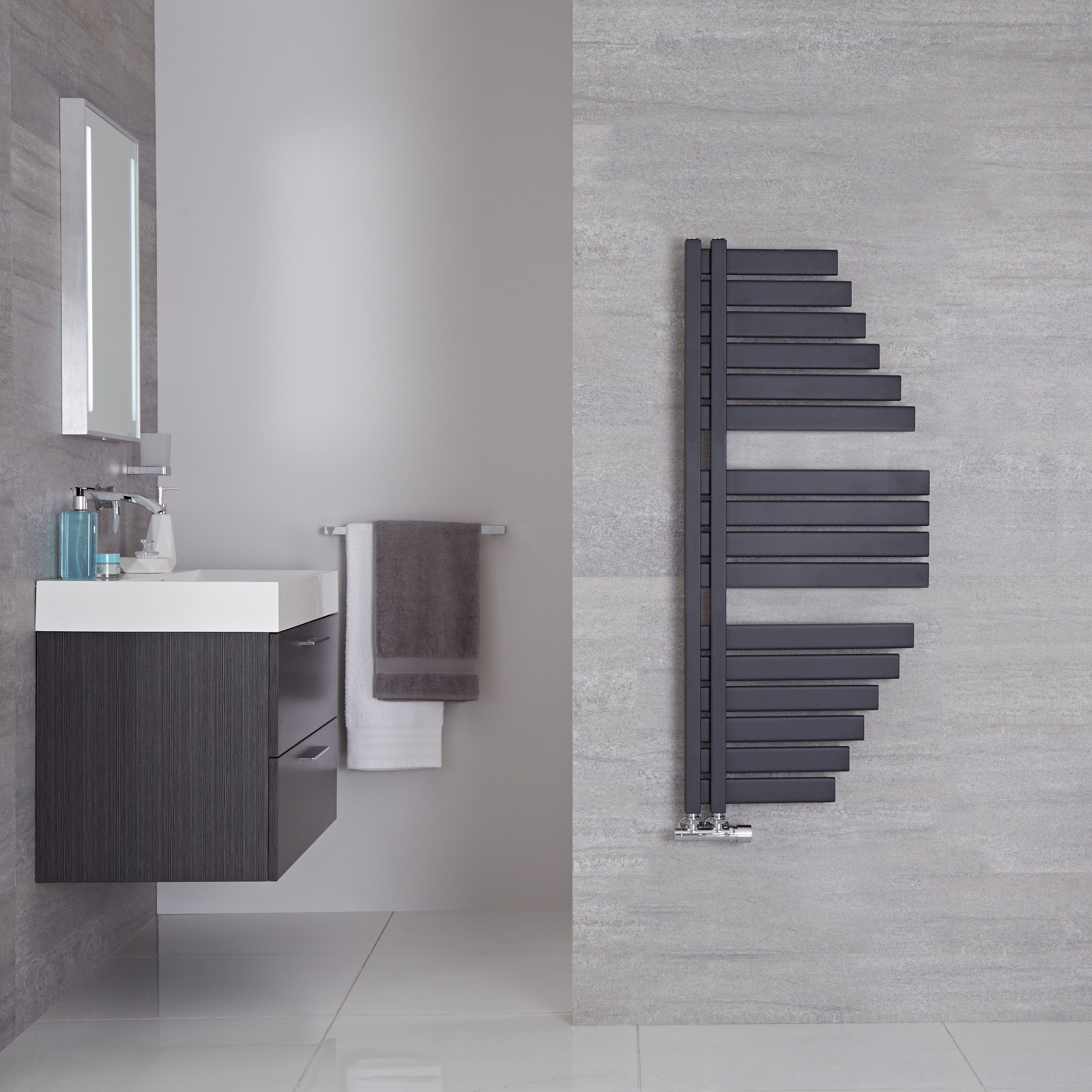 Ein ungewöhnliches Design und eine trendige anthrazitgraue Lackierung lassen den Handtuchheizkörper zum Mittelpunkt eines jeden Raumes werden. Die kompakte Größe ist ideal für die Installation in kleinen Bädern, Garderoben oder im Gäste-WC. Der Lazio bietet viel Platz für Handtücher und ein zeitgemäßes Design, dass den Look Ihres Badezimmers unterstreicht.