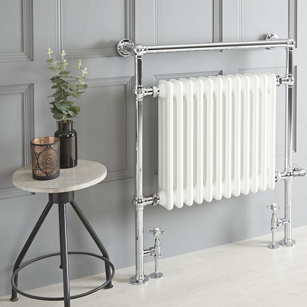 Der 930mm x 790mm Elizabeth Handtuchheizkörper in Chrom und Weiß wird an die Zentralheizung angeschlossen, kann aber zudem auch elektrisch betrieben werden und bietet Ihnen somit die perfekte Kombination aus traditionellem Design und moderner Heiztechnologie. Vervollständigt wird das Ensemble durch verchromte Heizventile und ein 800W Heizelement.