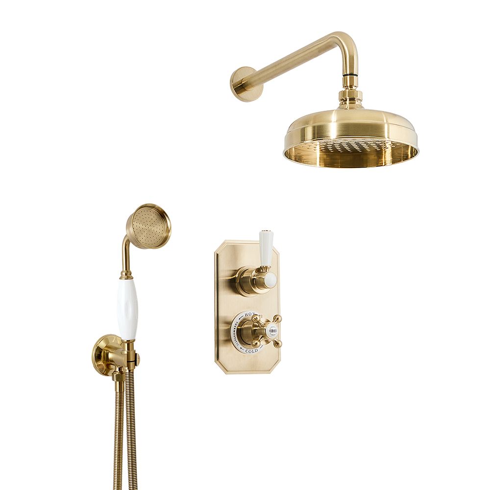 Retro-Duschsystem mit Unterputz-Thermostat – inkl. 205mm rundem Wand-Duschkopf und Handbrauseset - satiniertes Gold – Elizabeth
