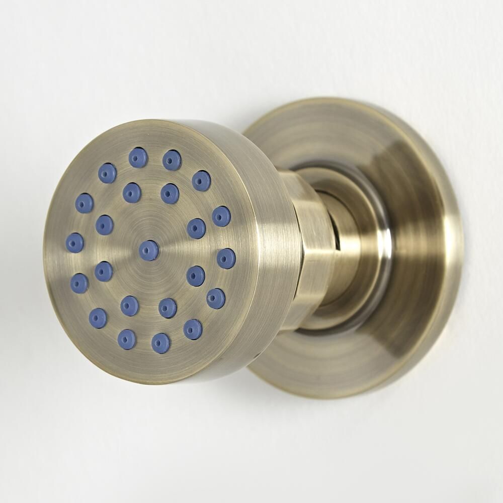 Die Körperdüse ist aus massivem Messing gefertigt und garantiert eine lange Lebensdauer. Die feuchtigkeitsbeständige, Antikgoldfarbe und die Silikondüsen sorgen dafür, dass Kalkablagerungen einfach abgewischt werden können. Der Körperstrahl sorgt für einen belebenden Wasserstrahl, der Sie mit Energie versorgt und erfrischt, und dank des Frontfix-Designs ist die Installation einfach.