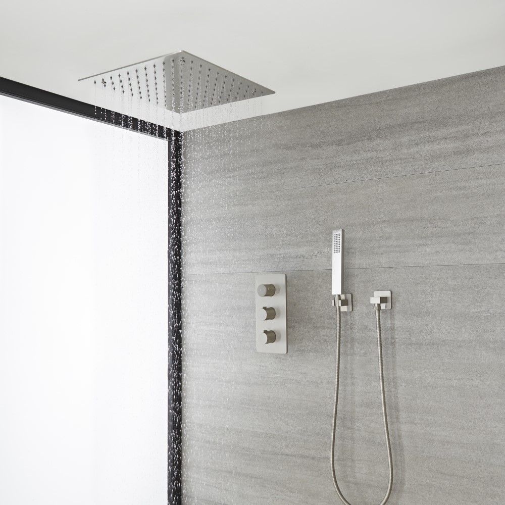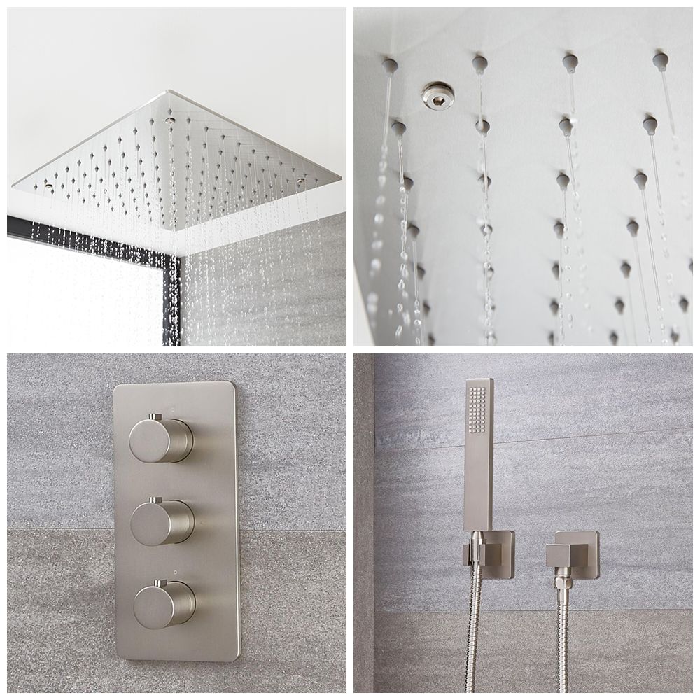 Genießen Sie mit der thermostatischen Harting Dusche in gebürstetem Nickel inklusive Thermostat, 400mm Unterputz-Duschkopf und Handdusche ein luxuriöses Duscherlebnis.