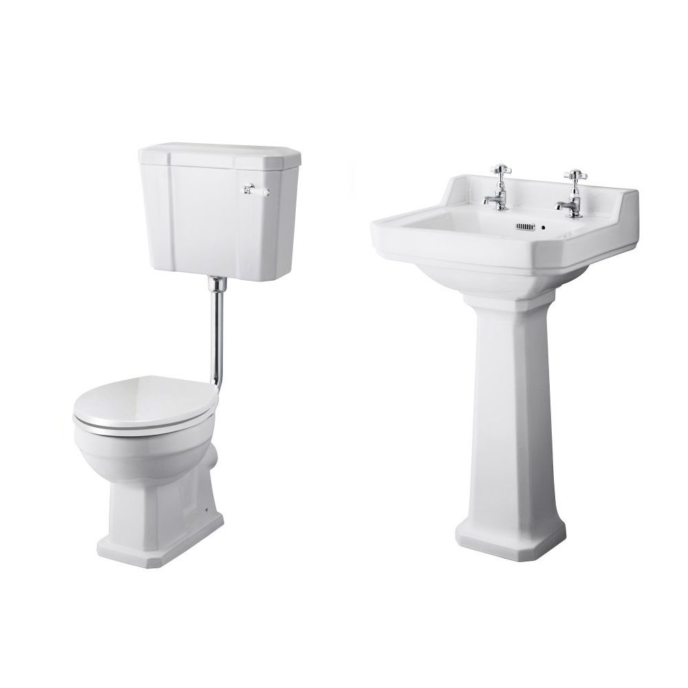 Das Set versprüht Klasse und Eleganz, und besteht aus einer freistehenden Badewanne mit Rückenschräge, verzierten Füßen und Wannenrandarmatur, einem Waschbecken mit Standsäule und separaten Kalt/Warm-Wasserhähnen sowie dem zweiteiligen Stand-WC mit Spülkasten, Sitz mit Absenkautomatik und verchromten Spülrohr. Die Badewanne wird zudem mit einer Ab- und Überlaufgarnitur, einem Siphon und einstellbaren Standrohren für die Badewannenarmatur vervollständigt.