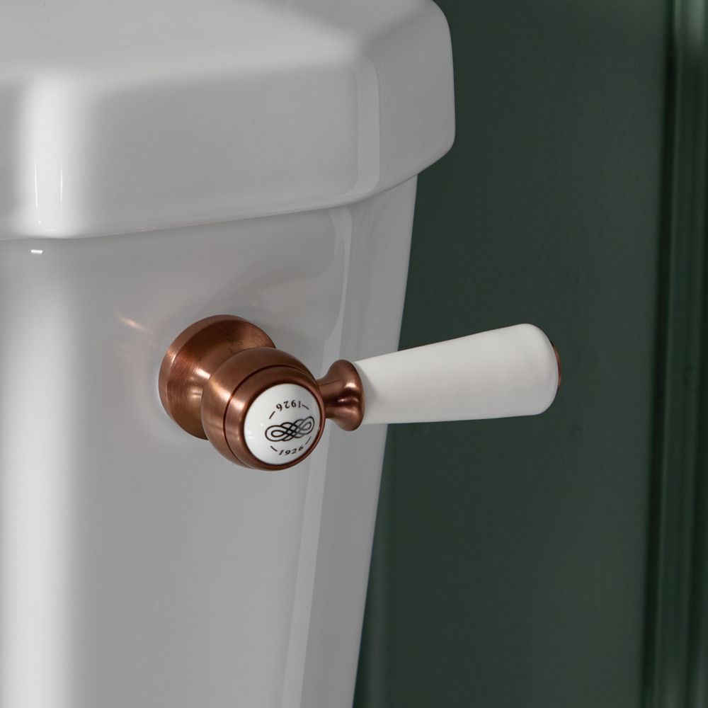 Dieser wunderschön verarbeitete Spülhebel aus der Elizabeth-Kollektion verfügt über ein strapazierfähiges Finish in satiniertem Kupfer für einen Hauch von Vintage-Chic und einen weißen Keramikgriff mit Keramik-Einsätzen. Der Hebel eignet sich für die Verwendung mit Spülkästen mit Hebeln aus den Richmond- und Ryther-Kollektionen. Er bietet eine ergonomische Form für eine einfache Bedienung und ein elegantes Design, das niemals aus der Mode kommt.