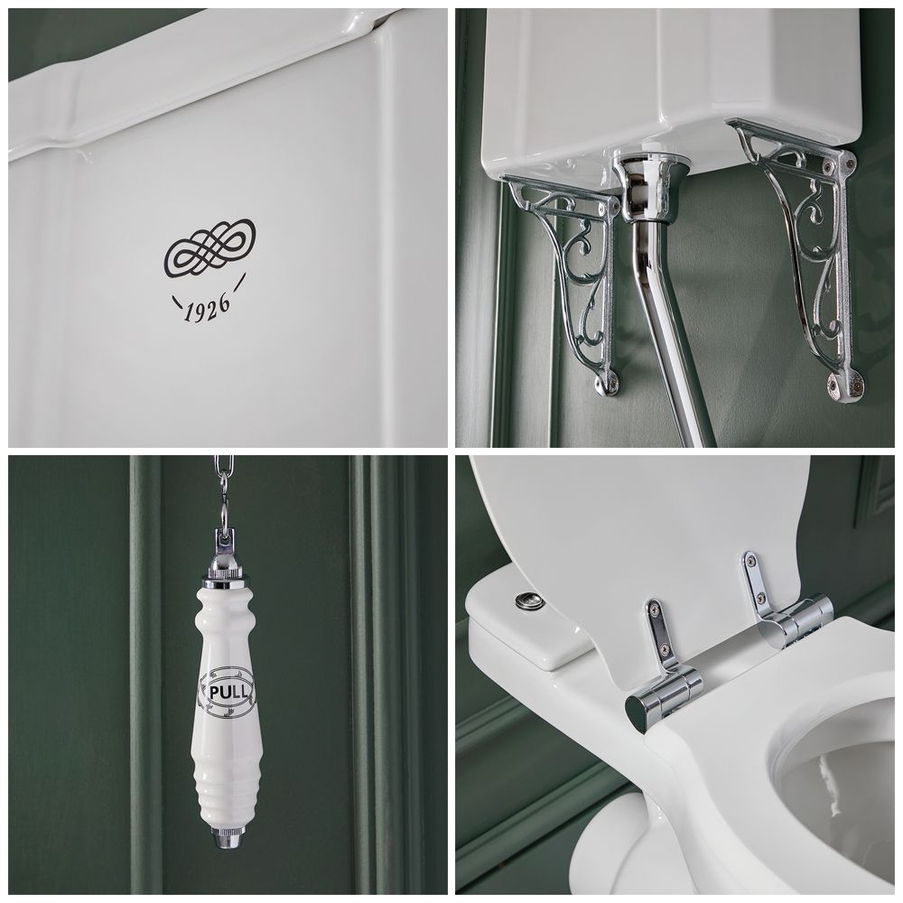 Kreieren Sie das perfekte Vintage-Badezimmer mit dem traditionellen Stand-WC aus der Elizabeth-Kollektion, komplett mit hohem Spülkasten und Sitz mit Absenkautomatik.